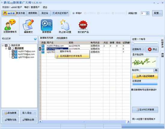 系统会提示验证码,然后等待,客户只要录入验证码后回车就可以完成注册。稍后进入帐号激活阶段,激活后,可以右键选帐号,点击“在浏览器中打开”,如下图:(由于腾讯对帐号注册限制极其严格,一般1个IP短时间也就注册2个帐号,所以推荐最好使用ADSL换IP模式去做注册帐号!请最好不要用代理服务器模式注册,那样很难成功。)