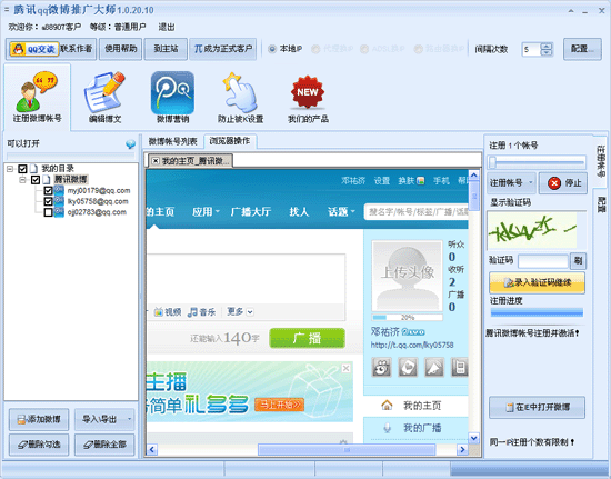 3、进行微博推广首先需要注册微博帐号,系统支持新浪微博的帐号辅助注册,你只要填写验证码就好,其他信息都可以交给软件来完成。