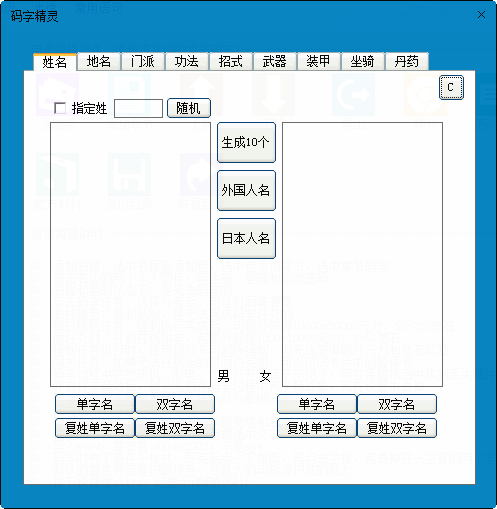 随机取名:随机生成男女姓名、地名、功法、招式、门派、武器等
