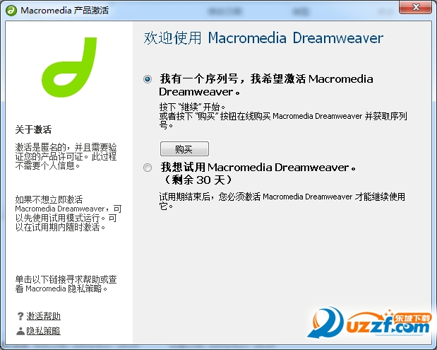 下面开始注册激活,运行Dreamweaver 8.0,会弹出激活页面,如图:直接点击右下角【继续】即可(这里就不要点那个购买按钮咯!)