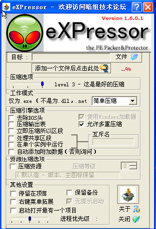 .exe 和 .dll 文件压缩工具, 压缩后的文件只有原文件的一半大小, 却丝毫不影响其运行.简单的说,就是经过压缩软件压缩的文件叫压缩文件,压缩的原理是把文件的二进制代码压缩,把相邻的0,1代码减少,比如有000000,可以把它变成6个0 的写法60,来减少该文件的空间。