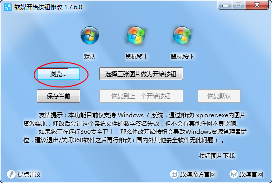 本功能目前仅支持Win7系统,通过修改Explorer.exe内的图片资源来实现,修改后会让这个系统文件的数字签名失效,但不会对系统造成任何影响。