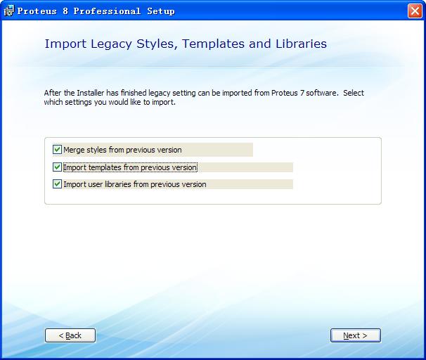 4、“点Close”关闭,弹出如下界面,意思是问要不要导入proteus 7的配件文件,我们把三项全部选中。