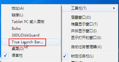 安装完成后,用鼠标右键点击系统的任务栏,然后鼠标移动到最上方的工具栏,在弹出的菜单中选择“True Launch Bar”即可!