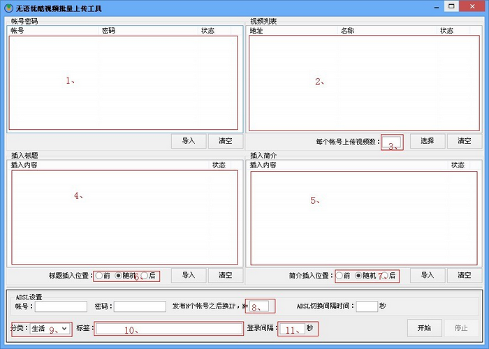 无语优酷视频批量上传工具,可以模拟人工操作“爱酷”,实现多帐号,多视频批量上传的目的。上传视频的标题与简介即导入视频时的视频名称,并且可以导入文本,软件可对标题和简介进行插入。达到推广网站,发布广告,增加外链等效果。