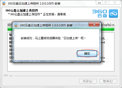 3、安装完成后点击【确定】,然后重启浏览器就可以实现加速上传了