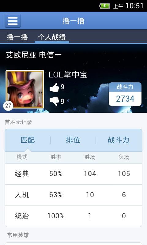 - 个性撸一撸(战绩查询):游戏加载时撸一撸,呼出对阵信息以及英雄出装,撸出双方战力信息,知己知彼百战不殆;绑定游戏账号,查询自己光辉战绩;