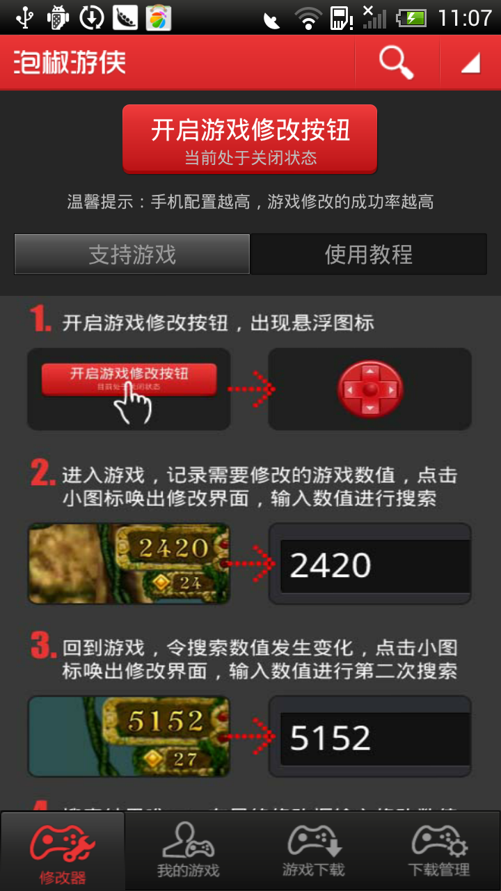 泡椒游侠是泡椒网推出的一款安卓游戏修改器,能够轻松修改正在运行中的游戏内存数据,达到修改游戏属性的目的。