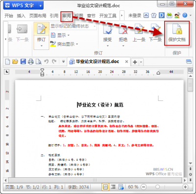 ②在菜单栏中点击【审阅】,在【审阅】中找到【文档保护】按钮,单击鼠标左键,如图2所示: