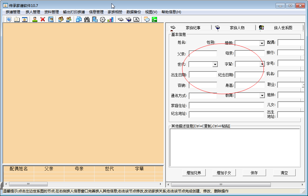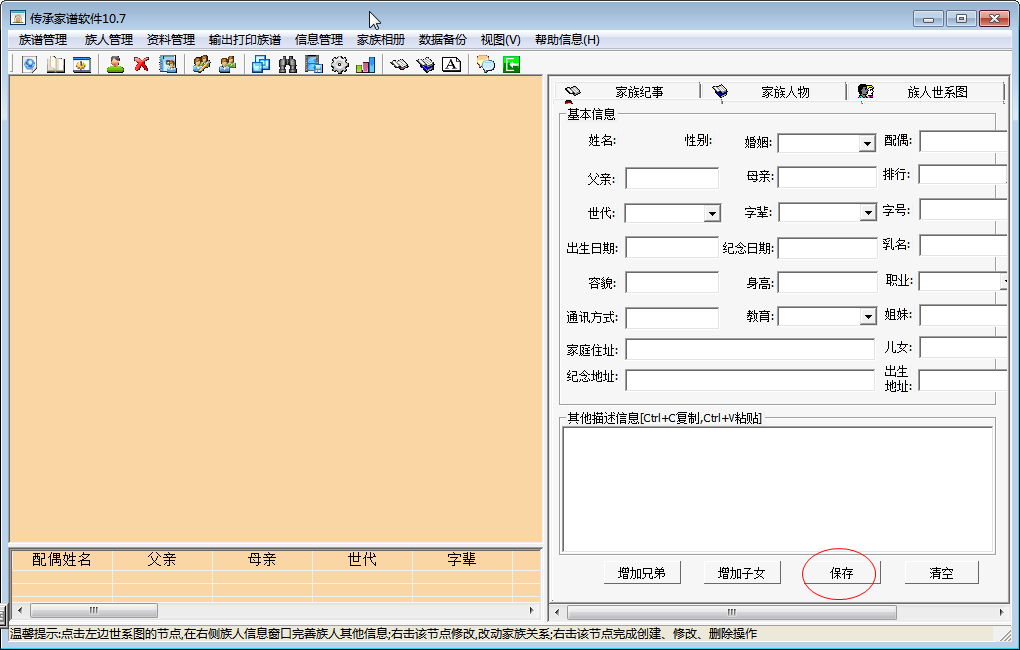 族人增加不受限制,没有级别,可以子子孙孙一直添加下去。可以保存族人的名人信息和家族的历史信息。家谱资料可以输出到word文档打印输出也可以输出到文本文件,word输出可以输出族人的图形信息。本程序为单机版本,数据库文件为单一文件,方便拷贝和备份。对机器环境要求简单,不必安装各种复杂的控件,只有操作系统就可以启动。