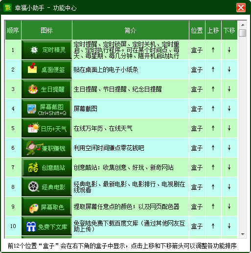幸福小助手是一款非常贴心的电脑桌面小工具,这款小工具可以帮您定时提醒、定时锁屏、定时关机、定时重启、定时执行某程序,此外还可以设置在某个时间点、或每天、或每星期几、或每隔多少分钟、或随开机启动执行。同时具有万年历、屏幕截图功能。