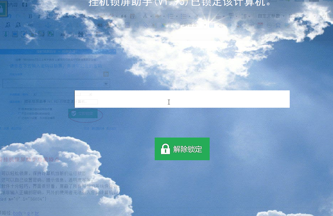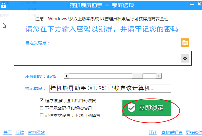 i特挂机锁屏助手是一款由奥威森研发部开发的屏幕锁定软件。若您需要临时离开电脑,却又不希望这台计算机另外的使用者对您的设置进行更改,若强化重启电脑,程序自动恢复,那么使用挂机锁屏助手是明智之举。