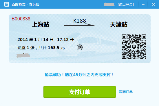 第四步,抢票成功后会有提示,点击“支付订单”进行支付就OK了