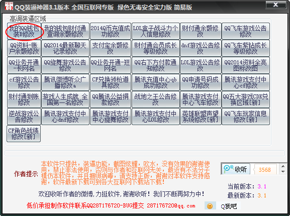 QQ恶搞神器具有CF CDKEY领枪无限领、cf官方网领枪无限领、QQ钱包查询余额、付通余额到账修改、QQ飞车恶搞游戏公告、QQiPhone永久登陆、腾讯微博听众和广播破10亿等恶搞功能。