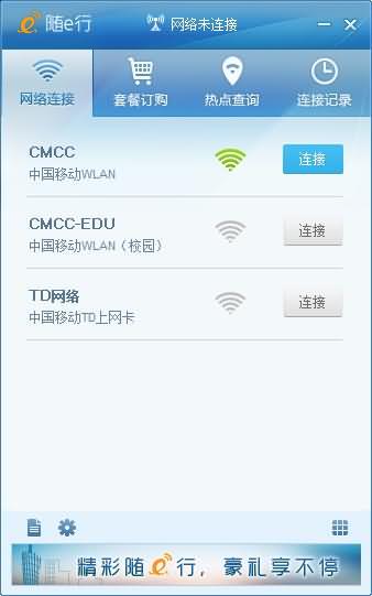 此时,面板上会显示CMCC、CMCC-EDU、以及TD网络的信号以及其信号强度。当某网络没有信号时,信号强度显示全灰,此时连接按钮不可用,也会变灰。当连接按钮为蓝色时,才可以连接该信号。