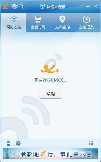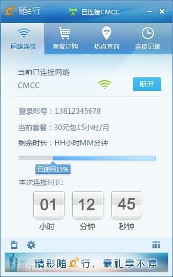 (2)中部:面板图标和功能列表区。面板图标包括“网络连接”、“套餐订购”、“热点查询”、“连接记录”。点击面板图标,功能列表区将显示对应的功能。