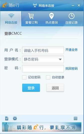 如上登录页中,默认的登录模式是静态登录。用户需输入用户名(即中国移动手机号码)以及WLAN登录密码,然后点击登录,即可成功上网。