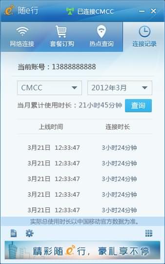 5、连接记录:为用户提供包含当前月份在内的最近六个月的CMCC历史连接记录。