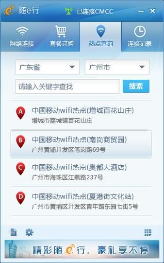 已连接网络后,用户可在热点查询面板界面搜索中国移动的热点信息。