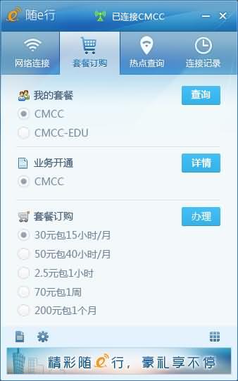 3、套餐订购:用户可根据自己的网络使用情况订购中国移动提供的各种WLAN上网套餐。