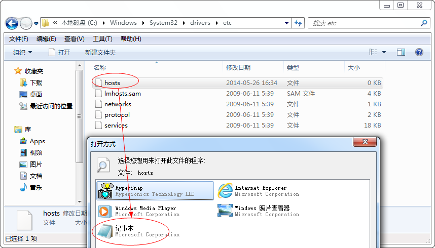 找到“hosts”这个文件,并用记事本打开“hosts”文件。如图: