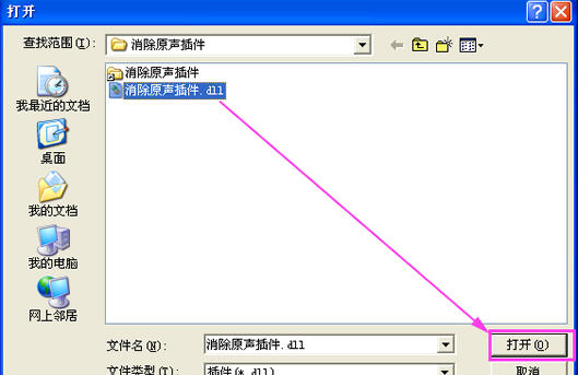 进入到“音频插件设置”窗口中,我们来安装这一款消除原音插件——点击这里添加插件,在打开窗口中打开下载好的插件: