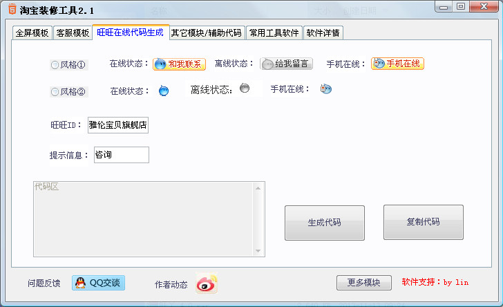 一个漂亮大方的淘宝店铺可以给你的营业额增收不少,一款免费、好用的淘宝装修软件就成了商家和美工们追逐的神器,今天小编就给您分享一款淘宝装修代码生成器,它能帮助您快捷高效的完成网店设计,具有全屏海报轮播、全屏单张海报、全屏背景固定、客服模板生成、旺旺代码生成、特效模板生成等功能。