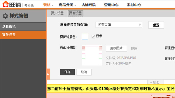 你进入店铺装修后台,找到“样式编辑”,选择“背景设置”,第一项“页头设置”是设置店招部分的背景颜色,也可以设置背景图片。第二项“页面背景”就是设置页面部分的背景颜色,你可以在“页面背景色”这一项点开,选择你喜欢的背景颜色。如果你是纯色背景,那底下的页面背景图可以不用上传和设置。