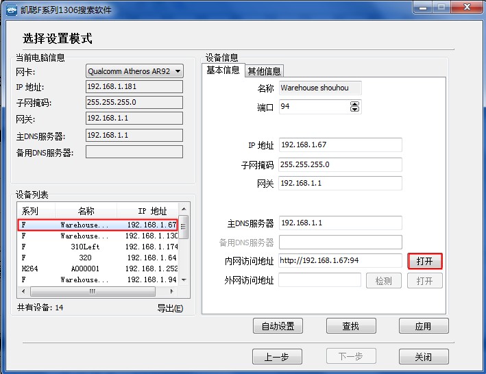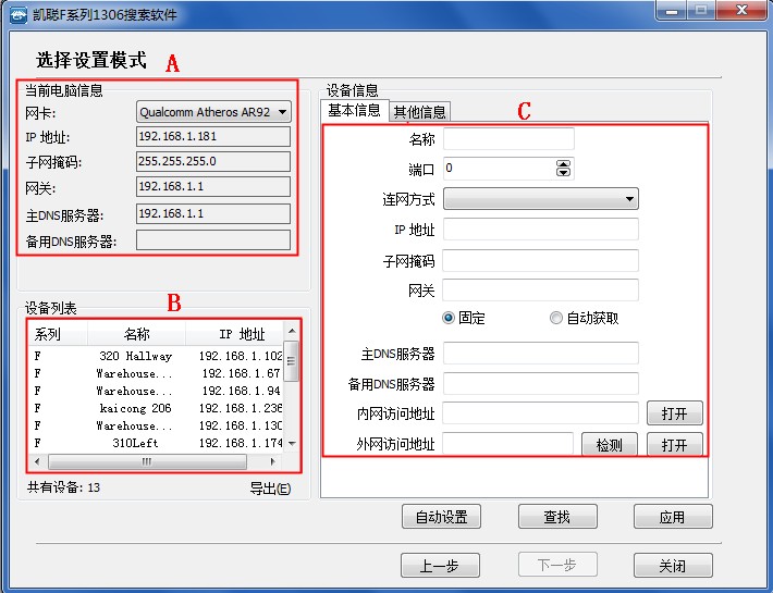 显示了当前接入局域网的所有凯聪的网络摄像机,本说明中总共接入了13台凯聪网络摄像机。