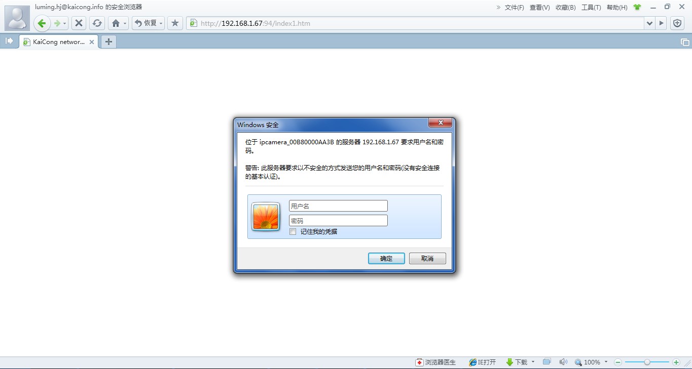 打开搜索工具软件,在搜索工具摄像机列表中选中需要查看的摄像机,点击右侧的“打开”,搜索工具软件会自动打开默认的浏览器,并弹出一个登录框。填入摄像机的登陆用户名(默认admin)和登陆密码(123456),登陆网络摄像机
