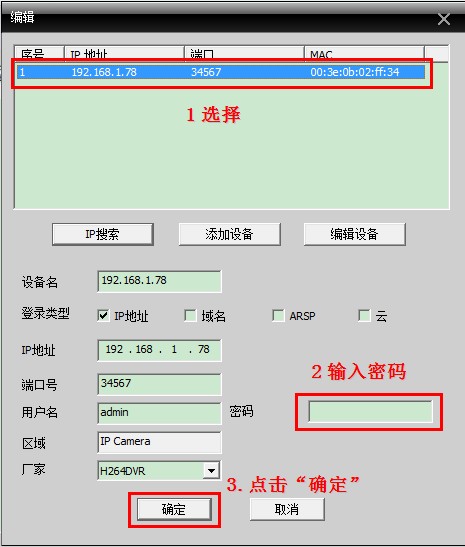 系统会自动配置摄像机的IP地址、端口号、用户名,用户只需要在此输入密码即可。