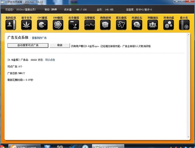 2、挂机赚钱。这是最简单的方式,收益也比较少。只要开着土财主,打开里面的流量赚钱功能就行,软件最小化就行!2M带宽的每挂3.5小时收5金币左右)。如果你是网站主,需要流量,也可以买,质量极高!)