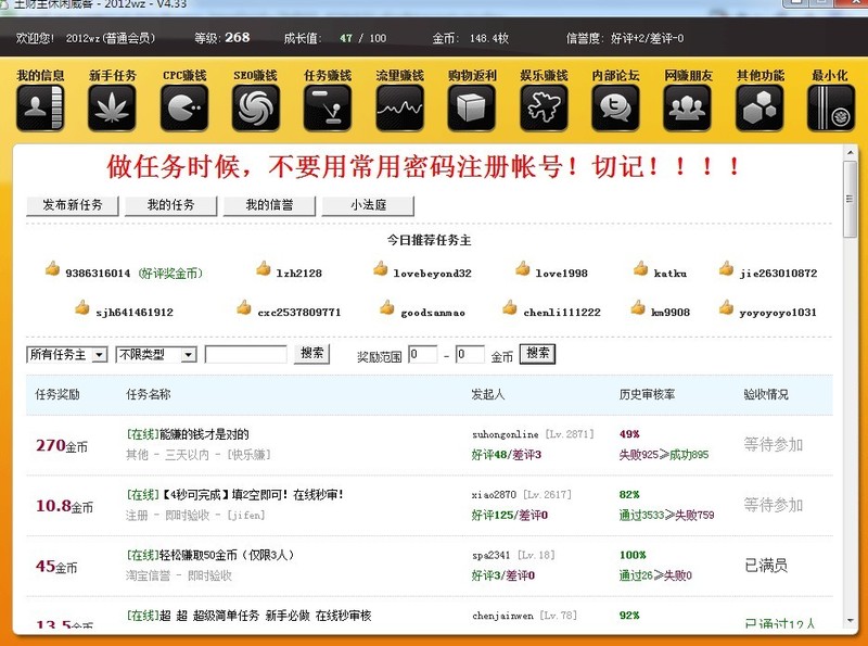 1、新手任务赚钱,这是土财主站长特意弄的,为的是让新加入的会员能够尽快熟悉软件的操作,照着里面的提示完成简单的任务就有不少金币,等于白送。(详情见土财主界面全图)