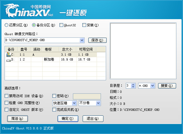 ChinaXV一键备份还原是一款傻瓜式的系统备份和还原工具。它具有安全、快速、保密性强、压缩率高、兼容性好等特点,特别适合电脑新手和担心操作麻烦的人使用。