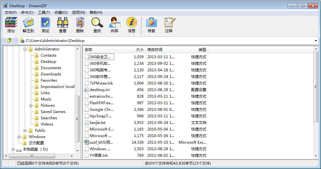 梦想压缩软件窗口的左部会包含文件夹树。如果你需要在磁盘中或压缩文件中快速导航时使用目录树很方便。你也可以用鼠标拖动它的右边改变文件夹树的宽度。