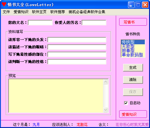 打开软件,依次填入您的大名,你爱人的芳名。再填写一下简单的资料,形容一下她的头发、眼睛、最性感的部位、性格什么的,然后选择你要的种类,是传统型、无敌型、思春型、革命数码型,最后点击生成,即可得到一份完美的情书了!