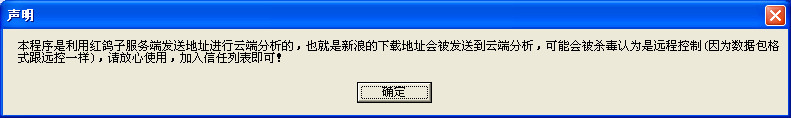 本程序是利用红鸽子服务端发送地址进行云端分析,也就是新浪的下载地址会被发送到云端分析,可能会被杀毒软件认为是远程控制,请放心使用,加入信任列表即可!