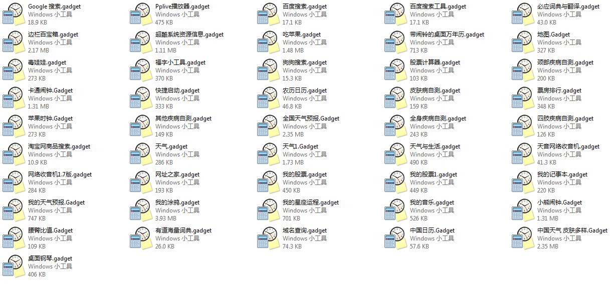 这个Win7桌面小工具集合了46个个非常实用的桌面工具,包括系统资源信息、时钟、搜索、日历、股票、天气、疾病自测、网址查询以及其他一些实用工具。