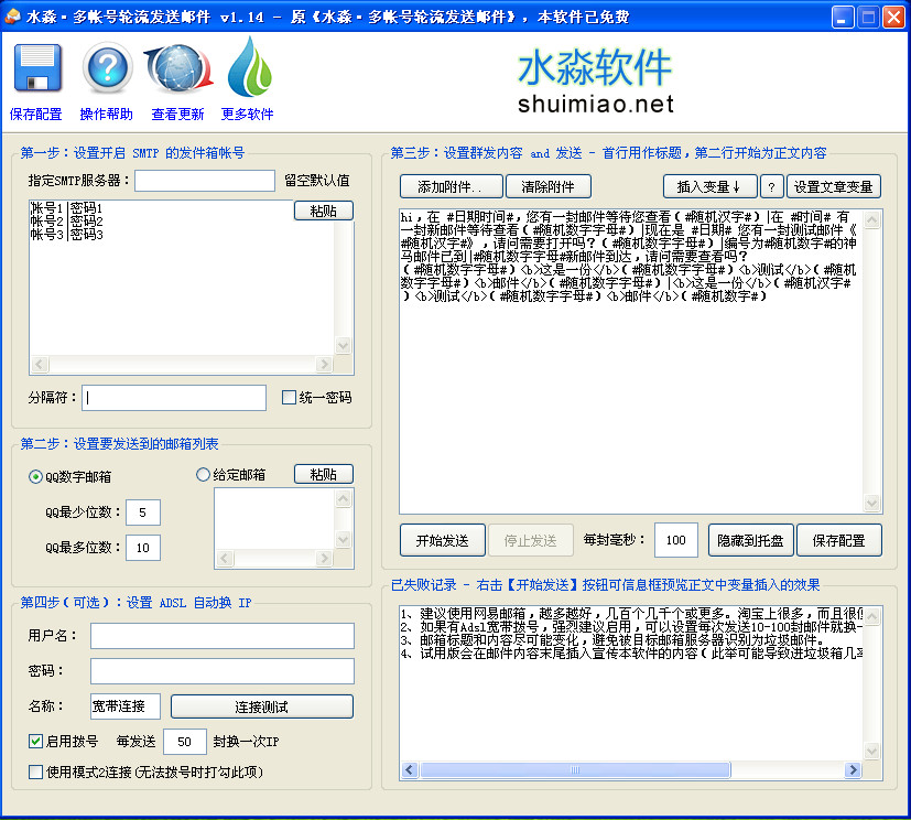 水淼多帐号轮流发送邮件是一款完全免费使用的多账号轮流发送邮件工具,实现了自动识别发件箱并连接该发件箱的smtp服务并实现多发件箱换ip轮流发邮件,使用方便快捷,操作简单,绿色免费。