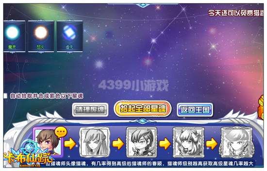 魂力要通过装备星魂来获得,小卡布们可以去【奥兹神殿】的【星魂殿】猎取星魂哦。