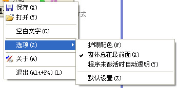 按下开始,具有保存,打开,空白文字,选项,关于等功能。选项包括:护眼配色,窗体总在最前面,程序未激活时自动透明,默认设置。