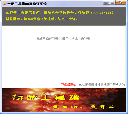 奇葩工具箱需要加群号220973771进行验证后才能使用,如360弹出拒绝提示,请点击允许。