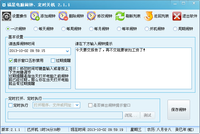 福星电脑闹钟定时关机是一款具有定时提醒、定时关机、定时打开程序、定时关闭程序的软件,同时还具有定时休眠、定时注销、定时锁定、定时宽带连接、定时断开宽带连接等功能于一身的软件,功能强大。定时提醒功能可选择一次提醒、每周提醒、每月提醒、每年提醒、开机提醒、周期提醒等多种提醒功能。