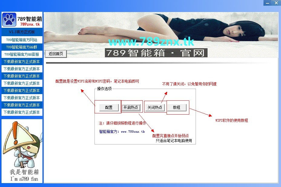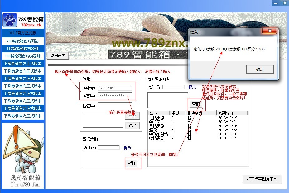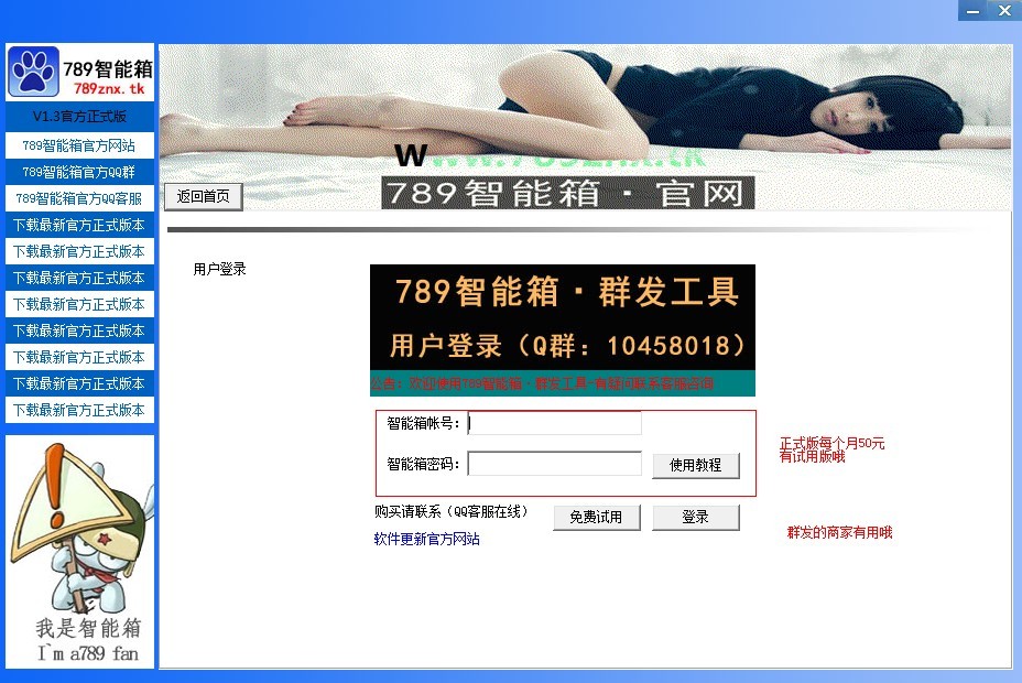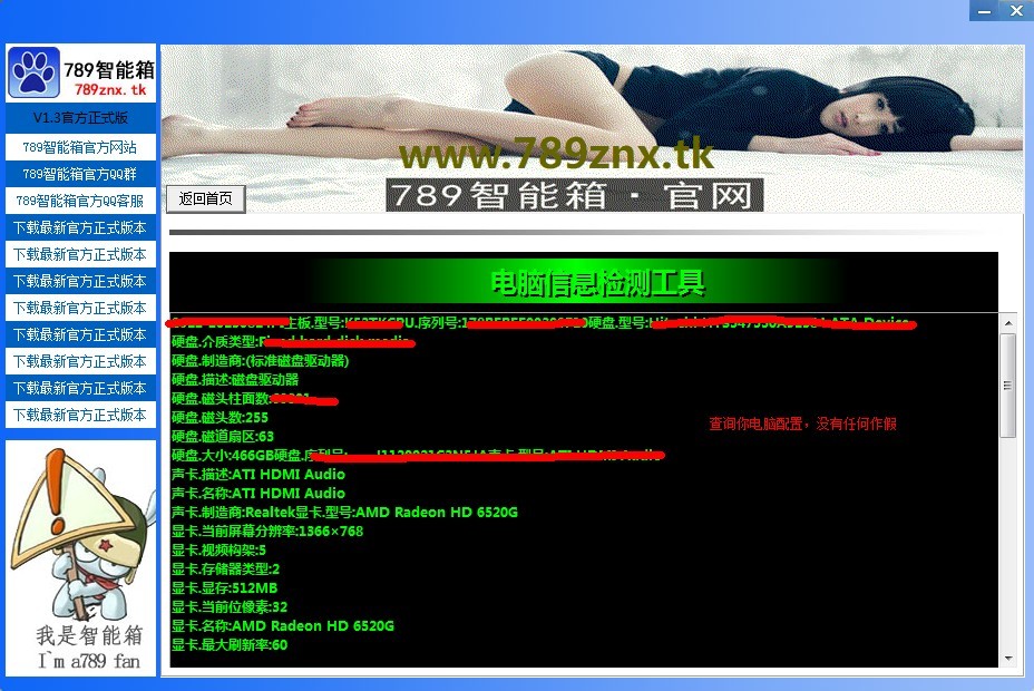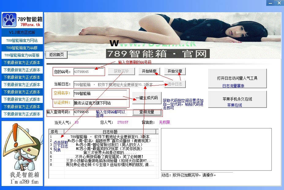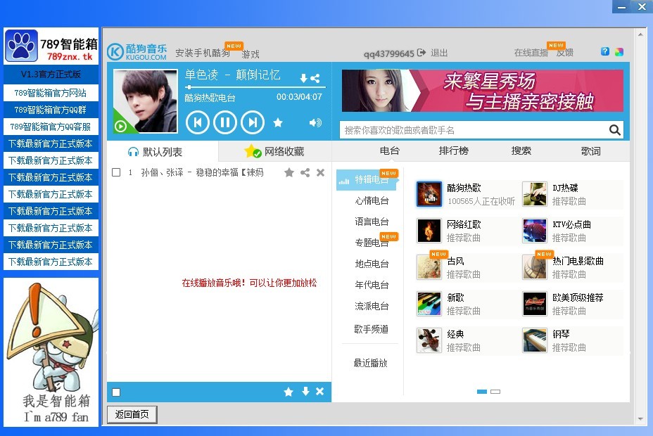 789智能箱是一款多功能集合工具箱软件,功能十分强大,绿色免费,使用简单方便,集合了日志转载、流量查询、Q币查询、图标点亮、快速群发、共享wifi、系统清理、电脑查询、在线音乐等功能,为您的日常使用带来方便和效率。