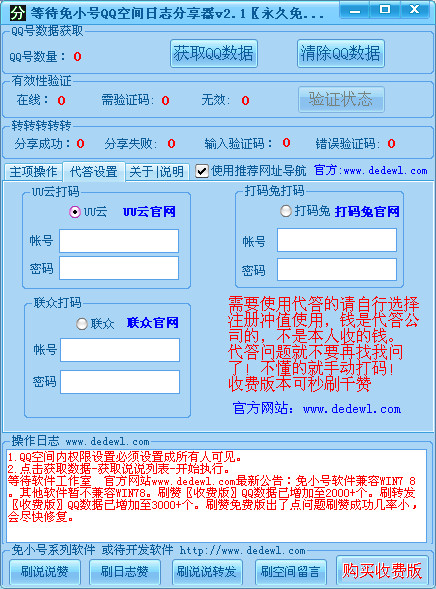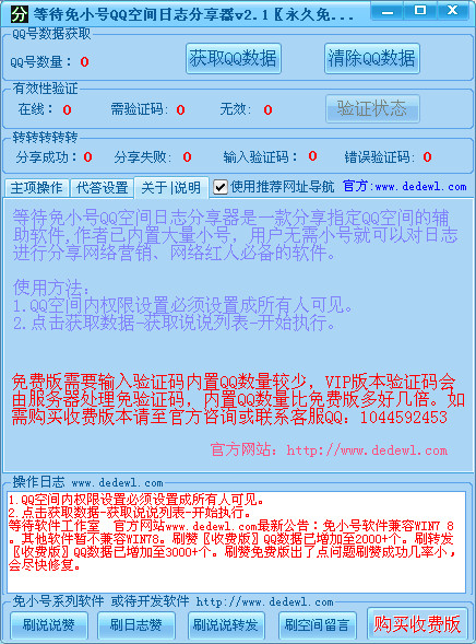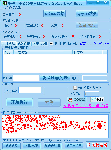 等待免小号QQ空间日志分享器帮助你快捷方便的分享指定空间的日志,让你摆脱手动操作的繁琐,无需小号,绿色免费,绝对是做网络营销必备的辅助软件。