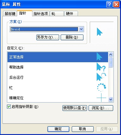 打开鼠标的属性,指针这一栏便可以设置自定义的鼠标图案。