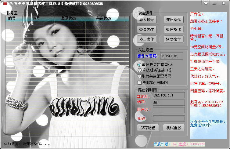 打开色虎歪歪批量刷关注工具,先导入账号,导入完成后点击开始操作即可。可以选择查看关注,单线程关注接口,使用路由器断网等功能。