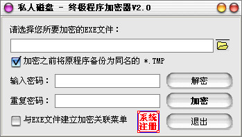 打开终极程序加密器,选择你所要加密的EXE文件,加密之前将原程序备份为同名的*.TMP,输入加密密码,点击加密/解密即可。还可以选择与EXE文件建立加密关联菜单。