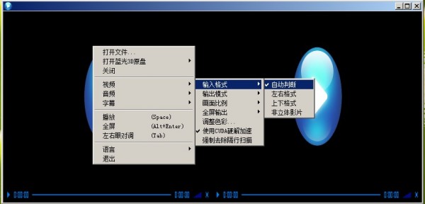 ┣输入格式:默认是自动识别,这个功能也是本播放器最大卖点,全自动识别左右半宽全宽,上下格式,还是2D文件,至今还没有识别错误的文件