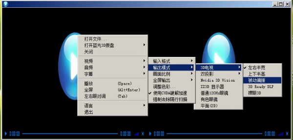 偏振3D电视(不闪的3D,眼镜轻巧)请选择上下格式或偏振格式,选上下格式,电视也同样选择,选偏振格式请保证电脑与电视信号点对点,然后电视无需设置直接观看